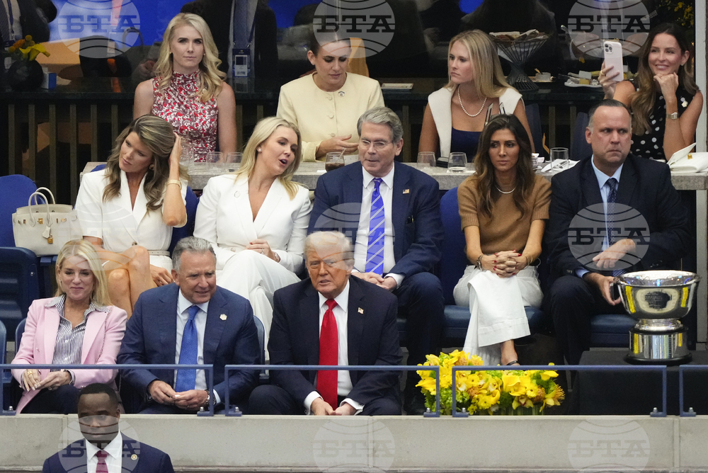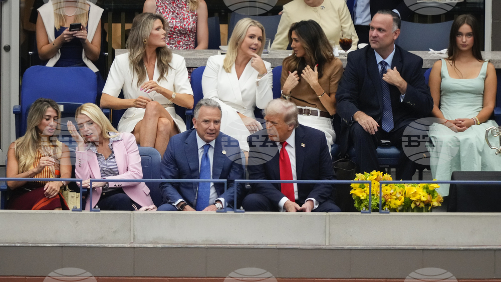 President Donald Trump, joined by Steve Witkoff, U.S. Attorney General Pam Bondi, Karoline Leavitt, White House press secretary, Lindsey Halligan, White House Deputy Chief of Staff, Dan Scavino, and Arabella Kushner, watches play between Carlos Alcaraz, of Spain, and Jannik Sinner, of Italy, during the men's singles final of the U.S. Open tennis championships, Sunday, Sept. 7, 2025, in New York. (AP Photo/Yuki Iwamura)