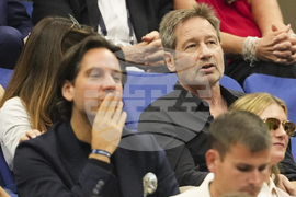 David Duchovny, right, watches play between Carlos Alcaraz, of Spain, and Jannik Sinner, of Italy, during the men's singles final of the U.S. Open tennis championships, Sunday, Sept. 7, 2025, in New York. (AP Photo/Kirsty Wigglesworth)