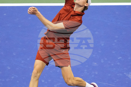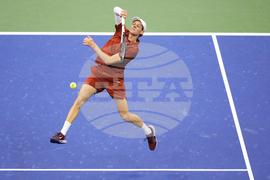 Jannik Sinner, of Italy, serves against Carlos Alcaraz, of Spain, during the men's singles final of the U.S. Open tennis championships, Sunday, Sept. 7, 2025, in New York. (AP Photo/Frank Franklin)