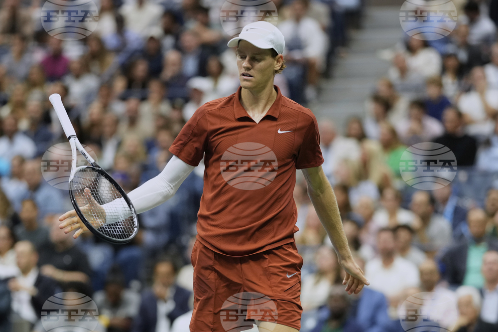 Jannik Sinner, of Italy, reacts during the men's singles final of the U.S. Open tennis championships against Carlos Alcaraz, of Spain, Sunday, Sept. 7, 2025, in New York. (AP Photo/Seth Wenig)