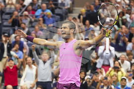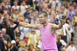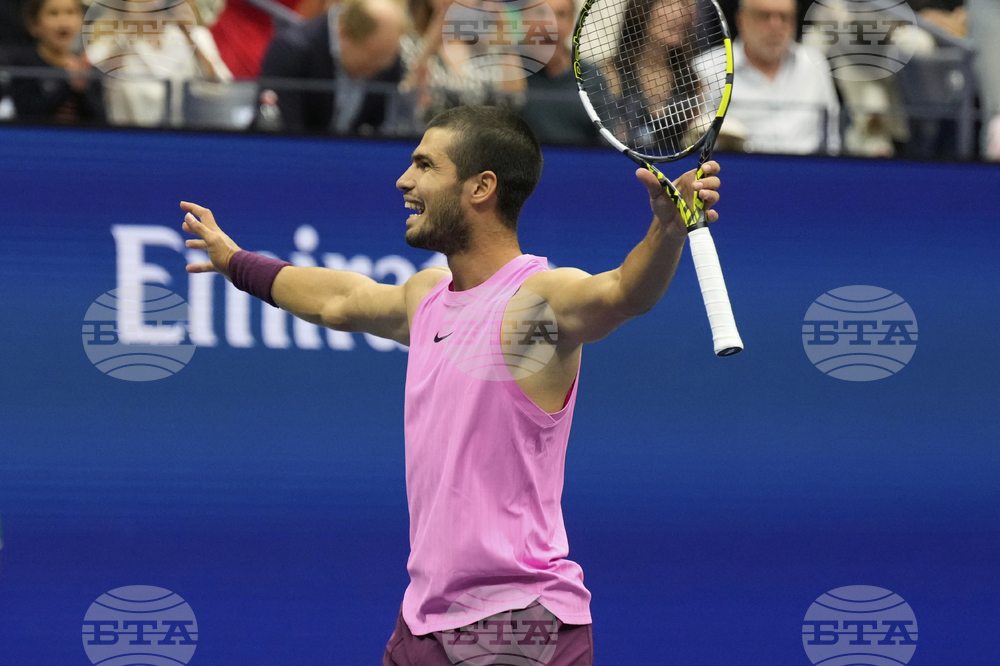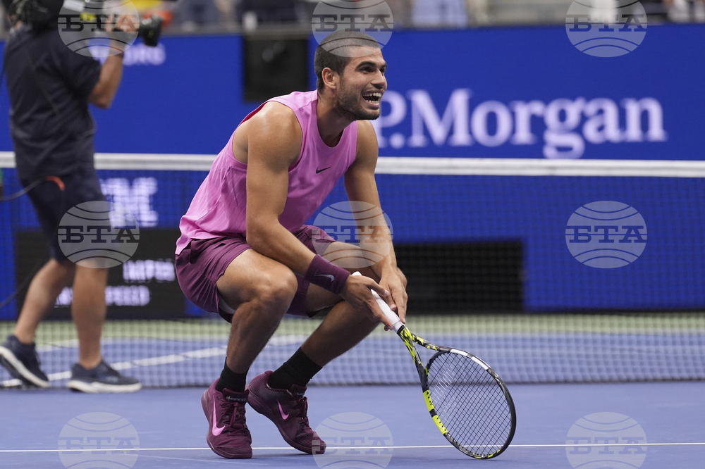 Carlos Alcaraz, of Spain, reacts after defeating Jannik Sinner, of Italy, to win the men's singles final of the U.S. Open tennis championships, Sunday, Sept. 7, 2025, in New York. (AP Photo/Seth Wenig)