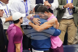 Carlos Alcaraz, of Spain, hugs supporters in his coaches' box after defeating Jannik Sinner, of Italy, in the men's singles final of the U.S. Open tennis championships, Sunday, Sept. 7, 2025, in New York. (AP Photo/Yuki Iwamura)