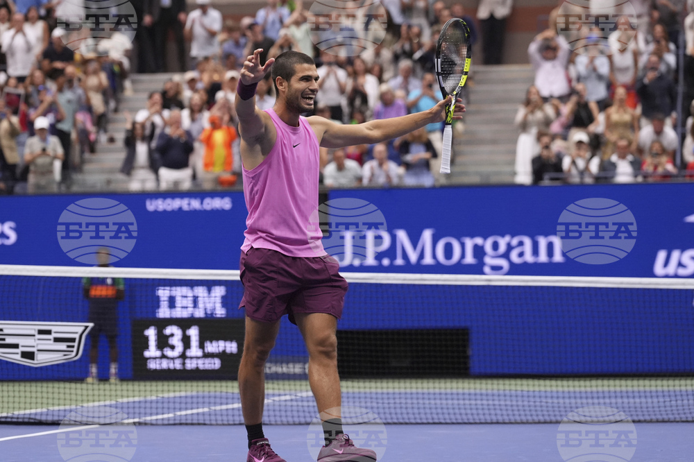 Carlos Alcaraz, of Spain, celebrates after defeating Jannik Sinner, of Italy, in the men's singles final of the U.S. Open tennis championships, Sunday, Sept. 7, 2025, in New York. (AP Photo/Kirsty Wigglesworth)