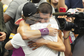 Carlos Alcaraz, of Spain, left, and Jannik Sinner, of Italy, right, embrace after their men's singles final of the U.S. Open tennis championships, Sunday, Sept. 7, 2025, in New York. (AP Photo/Seth Wenig)