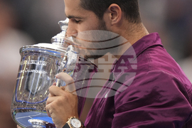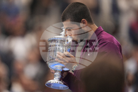 Carlos Alcaraz, of Spain, kisses the championship trophy after defeating Jannik Sinner, of Italy, in the men's singles final of the U.S. Open tennis championships, Sunday, Sept. 7, 2025, in New York. (AP Photo/Seth Wenig)