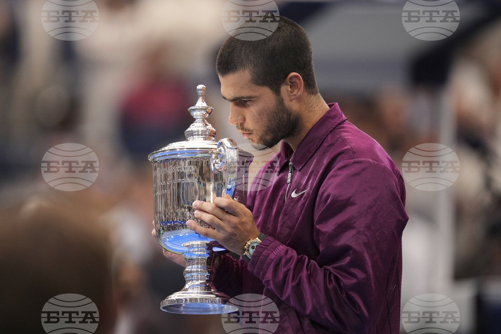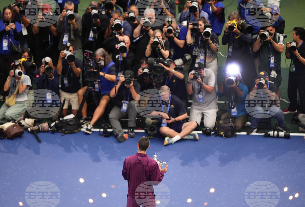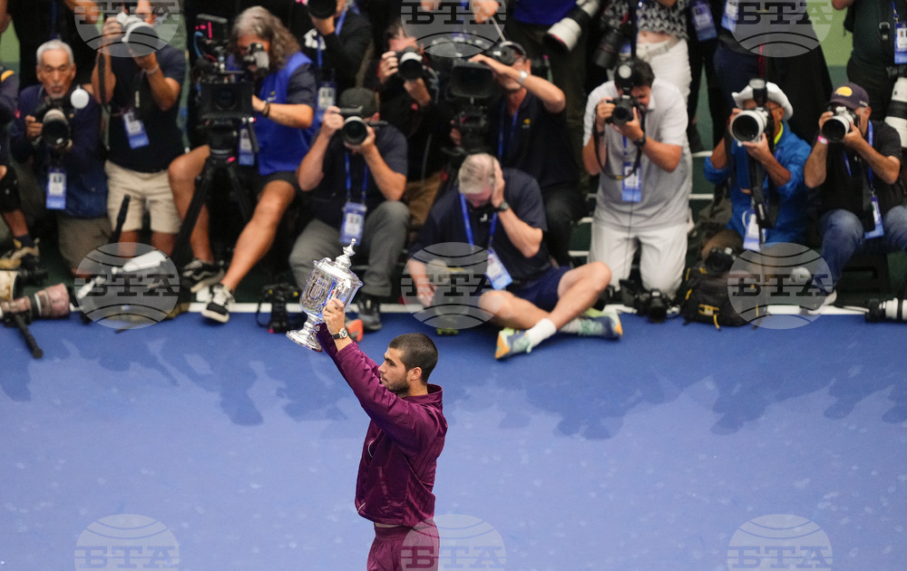 Carlos Alcaraz, of Spain, poses for photos with the championship trophy after defeating Jannik Sinner, of Italy, in the men's singles final of the U.S. Open tennis championships, Sunday, Sept. 7, 2025, in New York. (AP Photo/Yuki Iwamura)