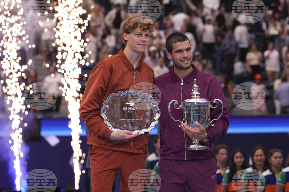 Jannik Sinner, of Italy, left, and Carlos Alcaraz, of Spain, right, hold their trophies after Alcaraz defeated Sinner to win the men's singles final of the U.S. Open tennis championships, Sunday, Sept. 7, 2025, in New York. (AP Photo/Frank Franklin II)