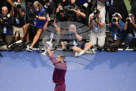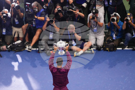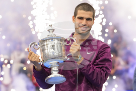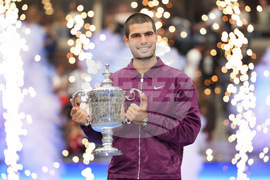 Carlos Alcaraz, of Spain, holds the championship trophy after defeating Jannik Sinner, of Italy, in the men's singles final of the U.S. Open tennis championships, Sunday, Sept. 7, 2025, in New York. (AP Photo/Yuki Iwamura)