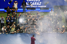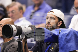 Landry Shamet, right, prepares to photograph the men's singles final between Jannik Sinner, of Italy, and Carlos Alcaraz, of Spain, at the U.S. Open tennis championships, Sunday, Sept. 7, 2025, in New York. (AP Photo/Yuki Iwamura)