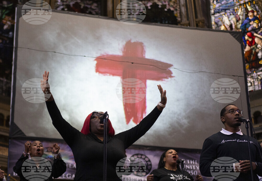 The New Mount Pilgrim Missionary Baptist Church choir, including Jennifer Hatch with arms raised, sings during a service Sunday, Sept. 7, 2025, in Chicago. (AP Photo/Carolyn Kaster)