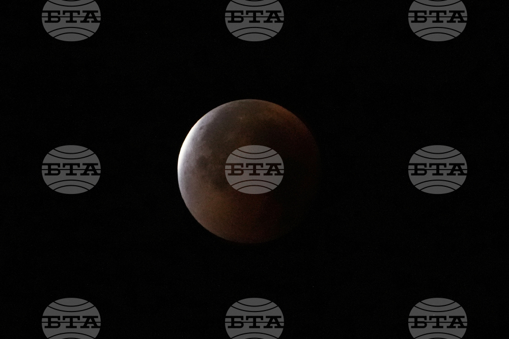 The moon turned red during a total lunar eclipse around 12.07 IST in Kolkata, India, Monday, Sept. 8, 2025. (AP Photo/Bikas Das)