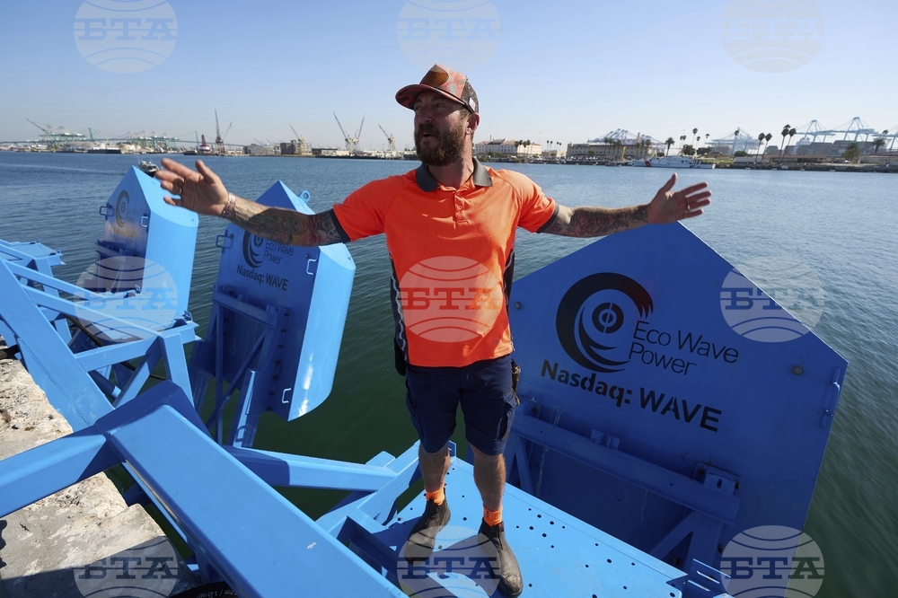An onshore wave energy site, a pilot by Eco Wave Power, at the Port of Los Angeles' AltaSea ocean institute, operates on Thursday, Sept. 4, 2025, in Los Angeles. (AP Photo/Damian Dovarganes)