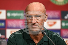 The head coach of the Hungarian national soccer team, Marco Rossi, adresses the media during a press conference in Telki, Hungary, Monday, Sept. 8, 2025, ahead of the FIFA 2026 World Cup qualifier soccer match against Portugal. (Tamas Purger/MTI via AP)