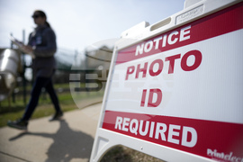 FILE - A Super Tuesday voter walks past a sign requiring a photo ID at a polling location, March 5, 2024, in Mount Holly, N.C. (AP Photo/Chris Carlson, File)