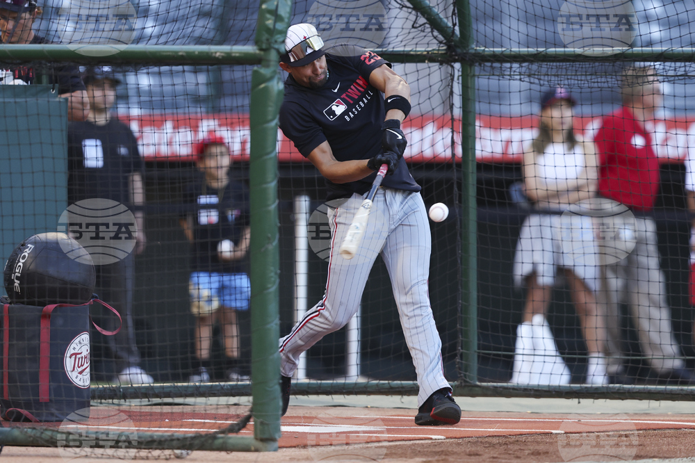 Minnesota Twins' Royce Lewis bats in the cage during batting practice before of a baseball game against the Los Angeles Angels, Tuesday, Sept. 9, 2025, in Anaheim, Calif. (AP Photo/Jessie Alcheh)