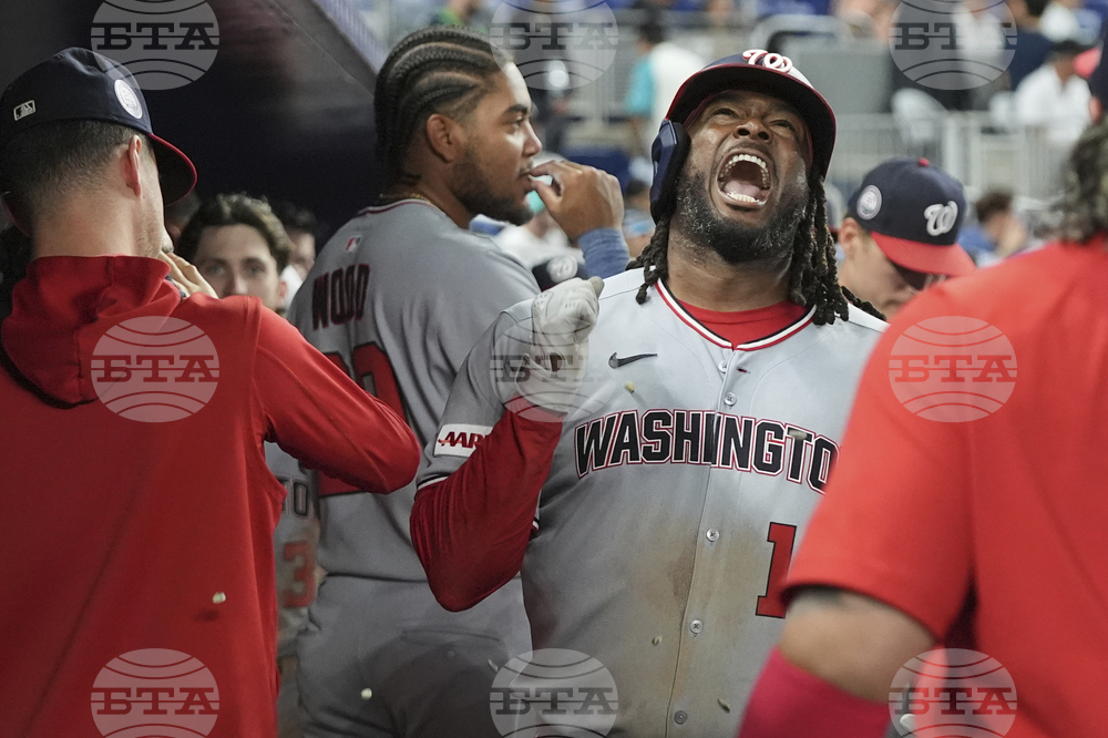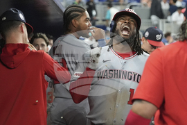Washington Nationals' Josh Bell (19) reacts after hitting a two run home run during the seventh inning of a baseball game against the Miami Marlins, Monday, Sept. 8, 2025, in Miami. (AP Photo/Lynne Sladky)
