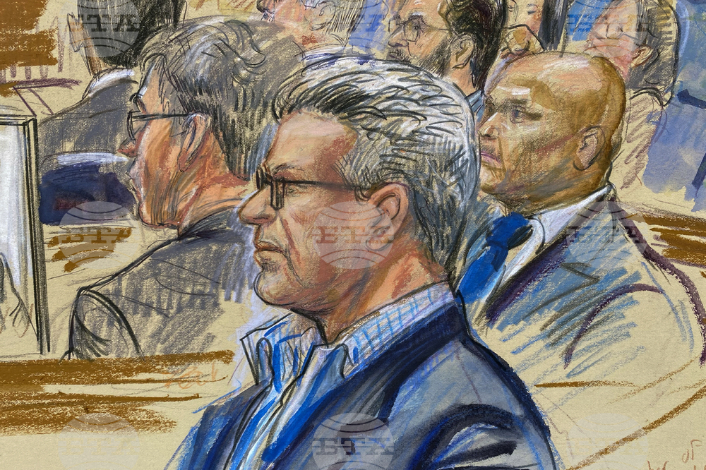 FILE - This artist sketch depicts Salah Al-Ejaili, foreground right with glasses, a former Al-Jazeera journalist, before the U.S. District Court in Alexandria, Va., April 16, 2024. (Dana Verkouteren via AP, File)