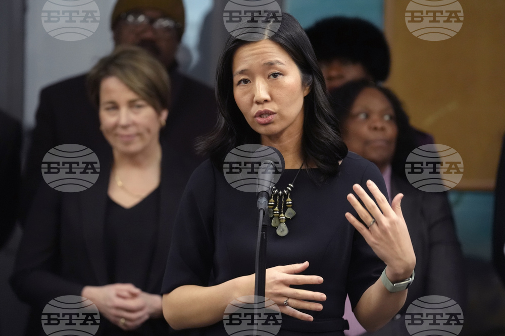 FILE - Boston Mayor Michelle Wu, center, and Massachusetts Gov. Maura Healey, left, take questions from reporters Jan. 31, 2024, after touring the Cass Recreational Complex, in the Roxbury neighborhood of Boston. (AP Photo/Steven Senne, File)
