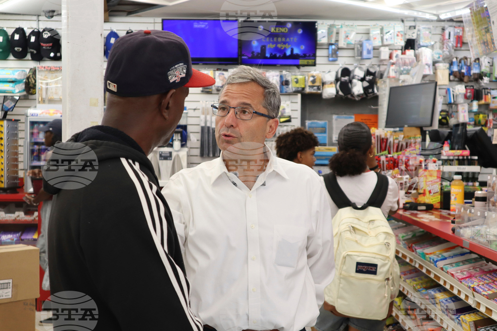 Nonprofit leader and Boston mayoral candidate Josh Kraft, son of Patriots owner Robert Kraft, speaks about his campaign with a resident at a convenience store while canvassing on Friday, Sept. 5, 2025, in Dorchester, Mass. (AP Photo/Leah Willingham)