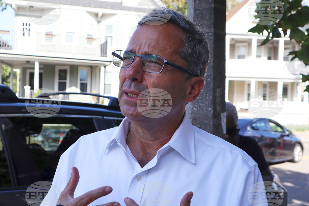 Nonprofit leader and Boston mayoral candidate Josh Kraft, son of Patriots owner Robert Kraft, speaks to a reporter about his campaign while canvassing on Friday, Sept. 5, 2025, in Dorchester, Mass. (AP Photo/Leah Willingham)