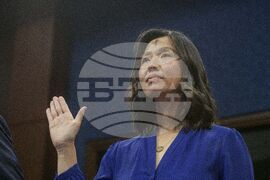 FILE - Boston Mayor Michelle Wu, is sworn in during a House Committee on Oversight and Government Reform hearing with Sanctuary City Mayors on Capitol Hill, March 5, 2025, in Washington. (AP Photo/Rod Lamkey, Jr., File)