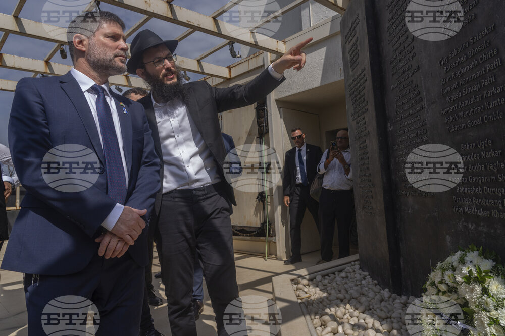 Israeli Finance Minister Bezalel Smotrich, left, and Director of Chabad House, Rabbi Israel Kozlovsky, look at the names inscribed on the memorial for the victims of the 2008 terror attack at the Nariman Lighthouse in Mumbai, India, Tuesday, Sept. 9, 2025. (AP Photo/Rafiq Maqbool)