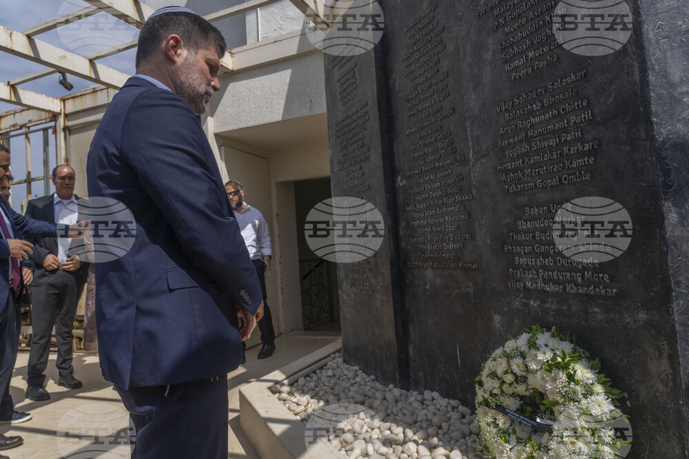 Israeli Finance Minister Bezalel Smotrich pays his respect to the victims of 2008 terror attack at Nariman lighthouse memorial in Mumbai, India, Tuesday, Sept. 9, 2025. (AP Photo/Rafiq Maqbool)