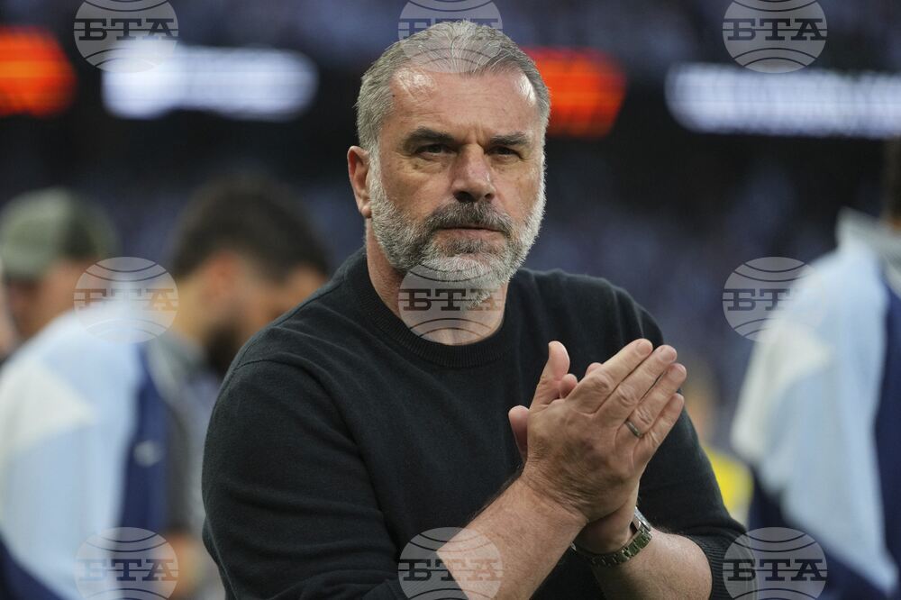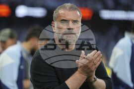 FILE - Tottenham's head coach Ange Postecoglou applauds during the Europa League semifinal first leg soccer match between Tottenham Hotspur and Bodo/Glimt at the White Hart Lane stadium in London, Thursday, May 1, 2025. (AP Photo/Kirsty Wigglesworth, File)