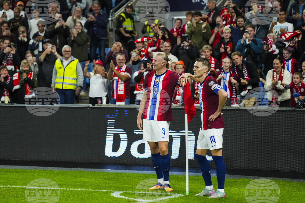 Norway's Erling Haaland, right, celebrates scoring during the World Cup qualifying soccer match between Norway and Moldova at Ullevaal Stadion, Oslo, Tuesday Sept. 9, 2025. (Fredrik Varfjell/NTB via AP)