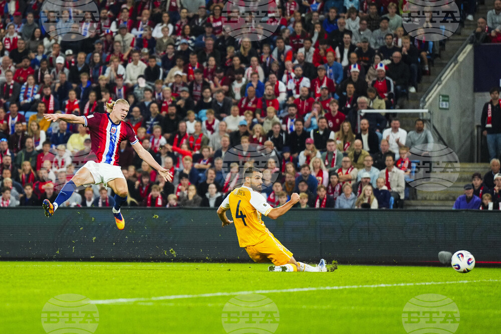 Norway's Erling Haaland, right, in action during the World Cup qualifying soccer match between Norway and Moldova at Ullevaal Stadion, Oslo, Tuesday Sept. 9, 2025. (Cornelius Poppe/NTB via AP)