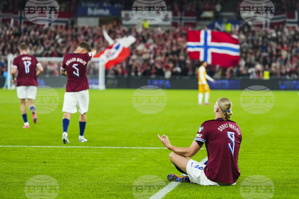Norway's Erling Haaland celebrates scoring during the World Cup qualifying soccer match between Norway and Moldova at Ullevaal Stadion, Oslo, Tuesday Sept. 9, 2025. (Fredrik Varfjell/NTB via AP)