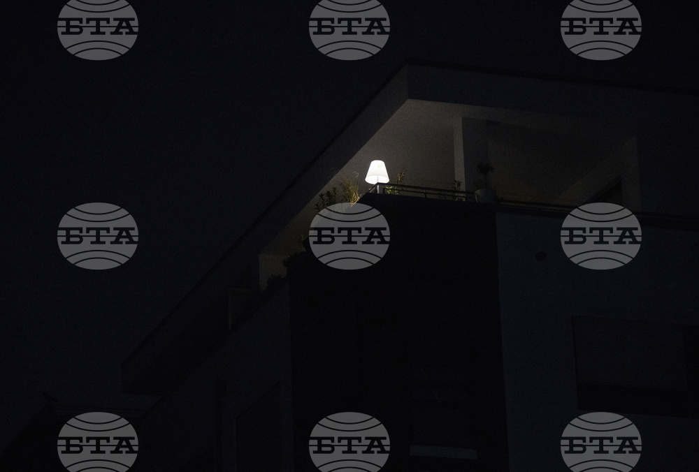 A battery-powered lamp on a balcony of a house in Adlershof during a widespread power cut in south-east Berlin, Tuesday, Sept. 9, 2025. (Bernd von Jutrczenka/dpa via AP)