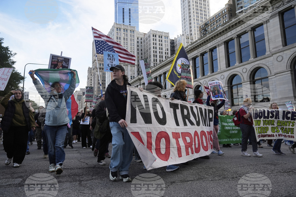 Demonstrators outside Trump International Hotel & Tower protest opposing "Operation Midway Blitz" and the presence of ICE, Tuesday, Sept. 9, 2025, in Chicago. (AP Photo/Erin Hooley)