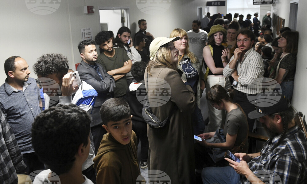 FILE - People who could not get into the Hamtramck city council chambers try to listen via YouTube or on the monitor in the hallway, during public comment on the flag neutrality law being considered by the city council in a meeting at City Hall in Hamtramck, Mich., June 13, 2023. (Robin Buckson/The Detroit News via AP, File)