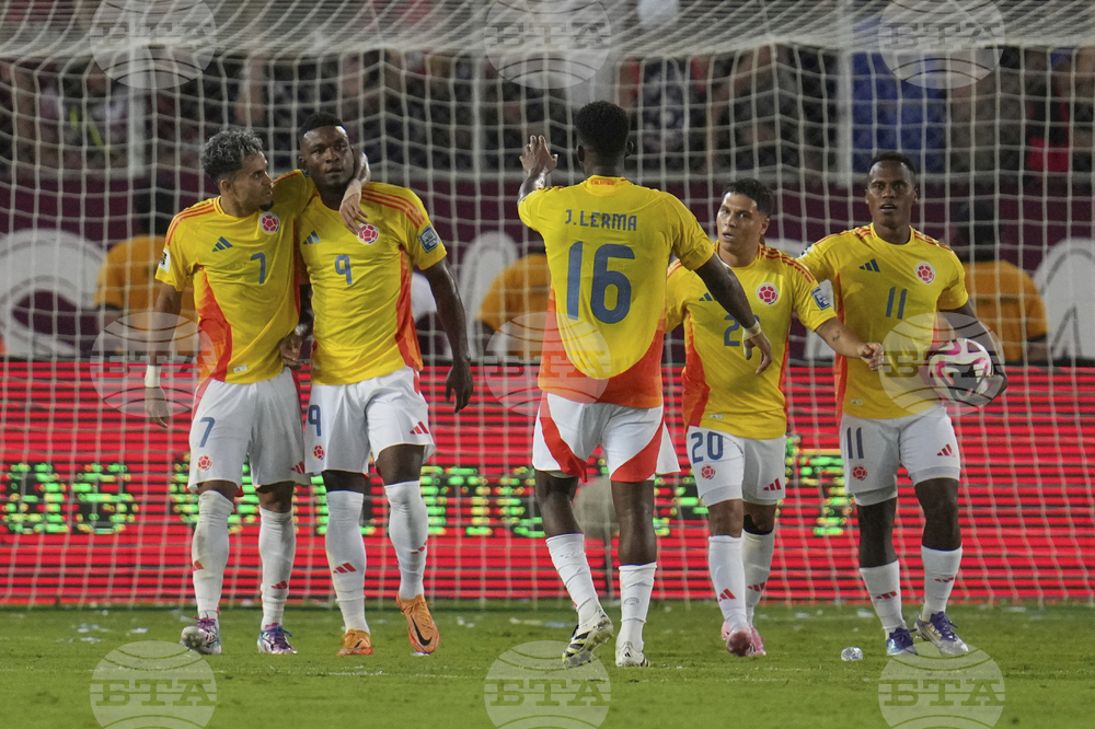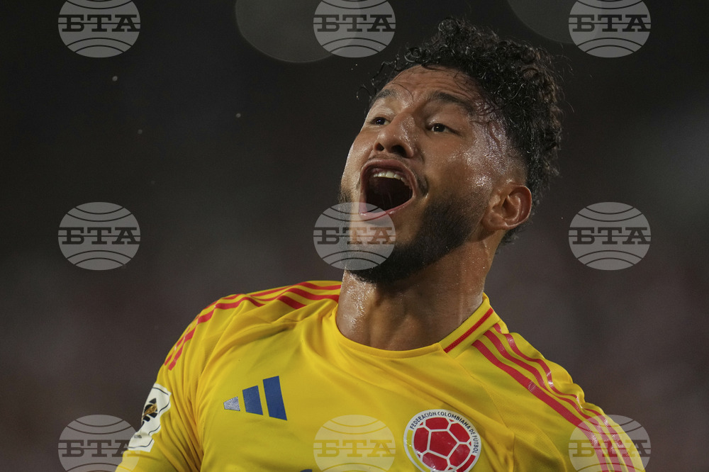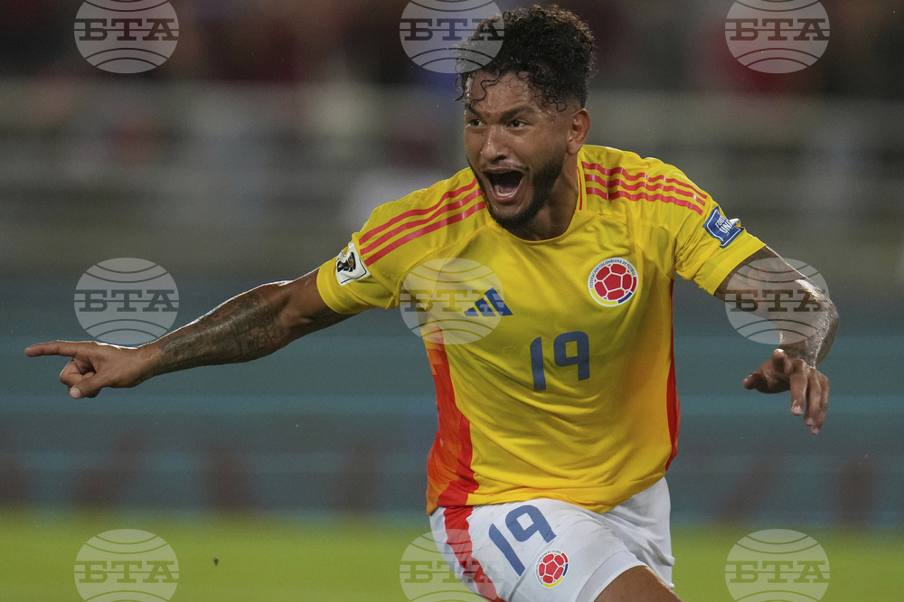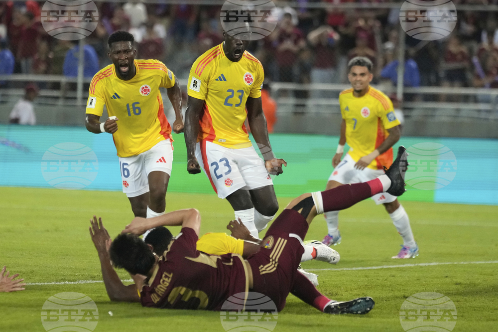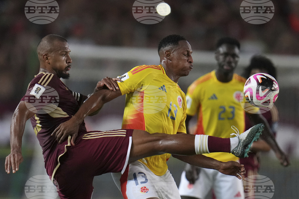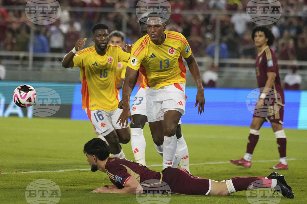 Colombia's Yerry Mina celebrates scoring his side's opening goal against Venezuela during a World Cup 2026 qualifying soccer match in Maturin, Venezuela, Tuesday, Sept. 9, 2025. (AP Photo/Ariana Cubillos)