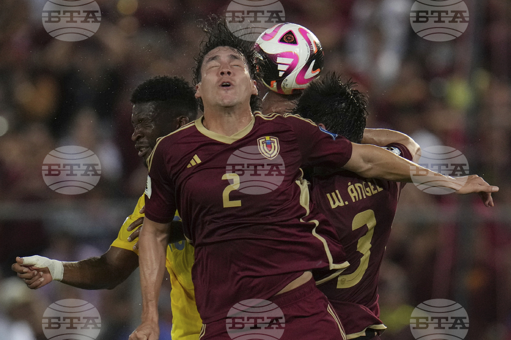 Venezuela's Nahuel Ferraresi heads the ball during a World Cup 2026 qualifying soccer match against Colombia in Maturin, Venezuela, Tuesday, Sept. 9, 2025. (AP Photo/Ariana Cubillos)