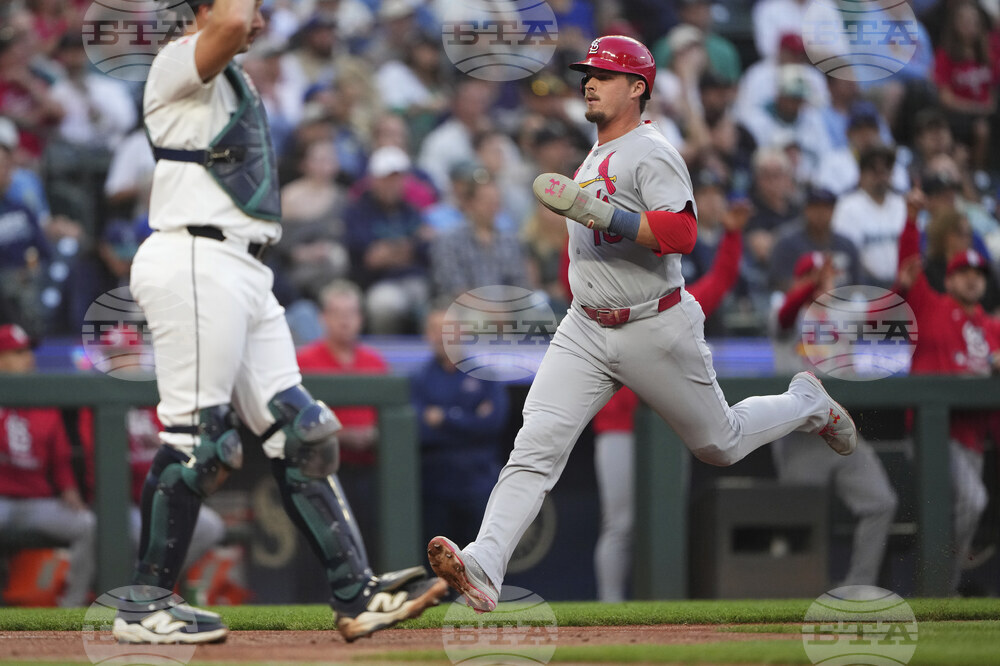 St. Louis Cardinals' Nolan Gorman scores on an RBI single from Thomas Saggese in front of Seattle Mariners catcher Cal Raleigh during the second inning of a baseball game Tuesday, Sept. 9, 2025, in Seattle. (AP Photo/Lindsey Wasson)
