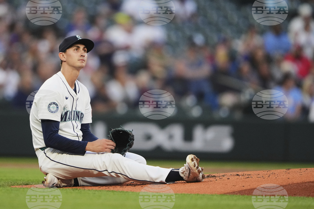 Seattle Mariners starting pitcher George Kirby reacts after an RBI single from St. Louis Cardinals' Thomas Saggese during the second inning of a baseball game Tuesday, Sept. 9, 2025, in Seattle. (AP Photo/Lindsey Wasson)