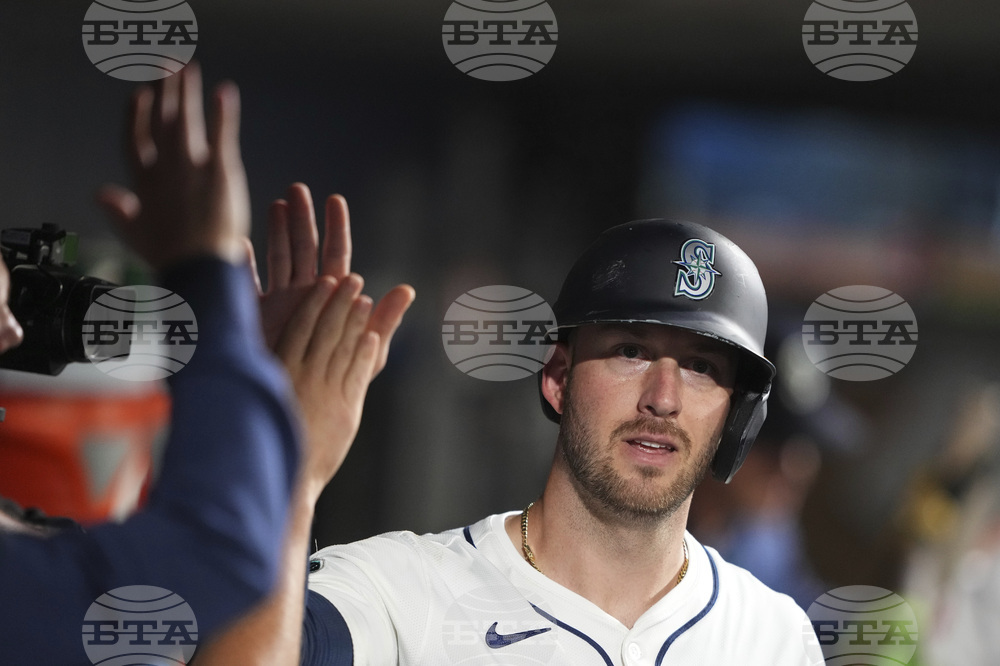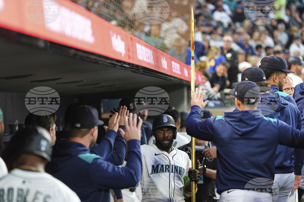 Seattle Mariners designated hitter Mitch Garver is greeted in the dugout after scoring against the St. Louis Cardinals on a sacrifice fly from Randy Arozarena during the fourth inning of a baseball game Tuesday, Sept. 9, 2025, in Seattle. (AP Photo/Lindsey Wasson)