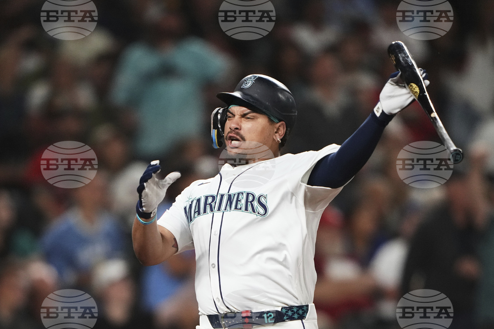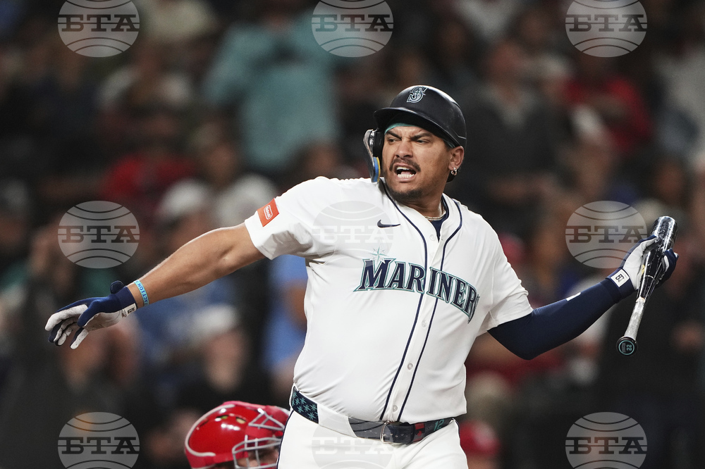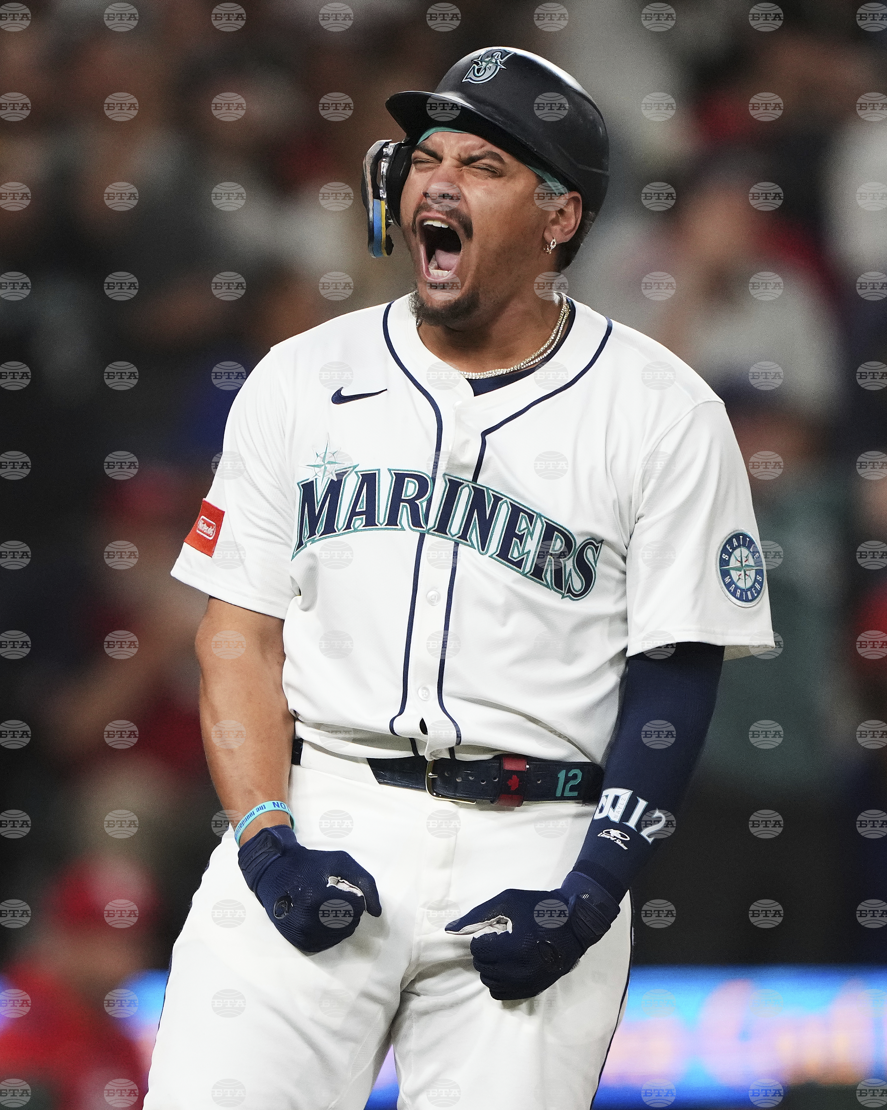 Seattle Mariners' Victor Robles reacts after hitting a single against the St. Louis Cardinals during the fourth inning of a baseball game Tuesday, Sept. 9, 2025, in Seattle. (AP Photo/Lindsey Wasson)