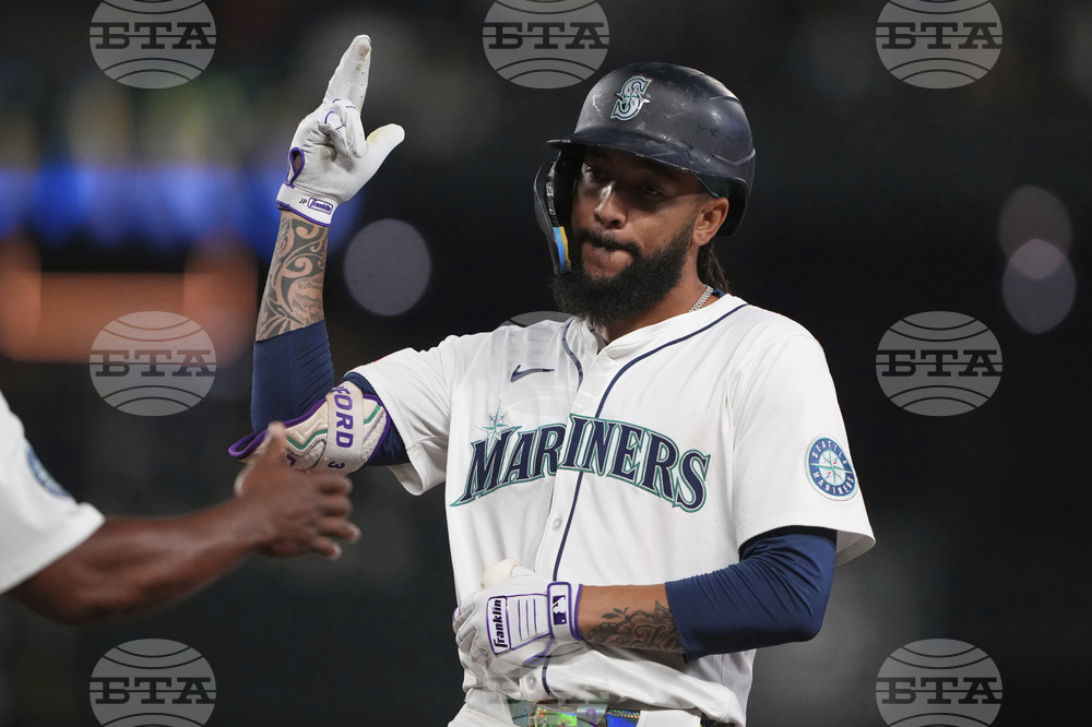 Seattle Mariners' Jorge Polanco reacts after hitting a double against the St. Louis Cardinals during the seventh inning of a baseball game Tuesday, Sept. 9, 2025, in Seattle. (AP Photo/Lindsey Wasson)
