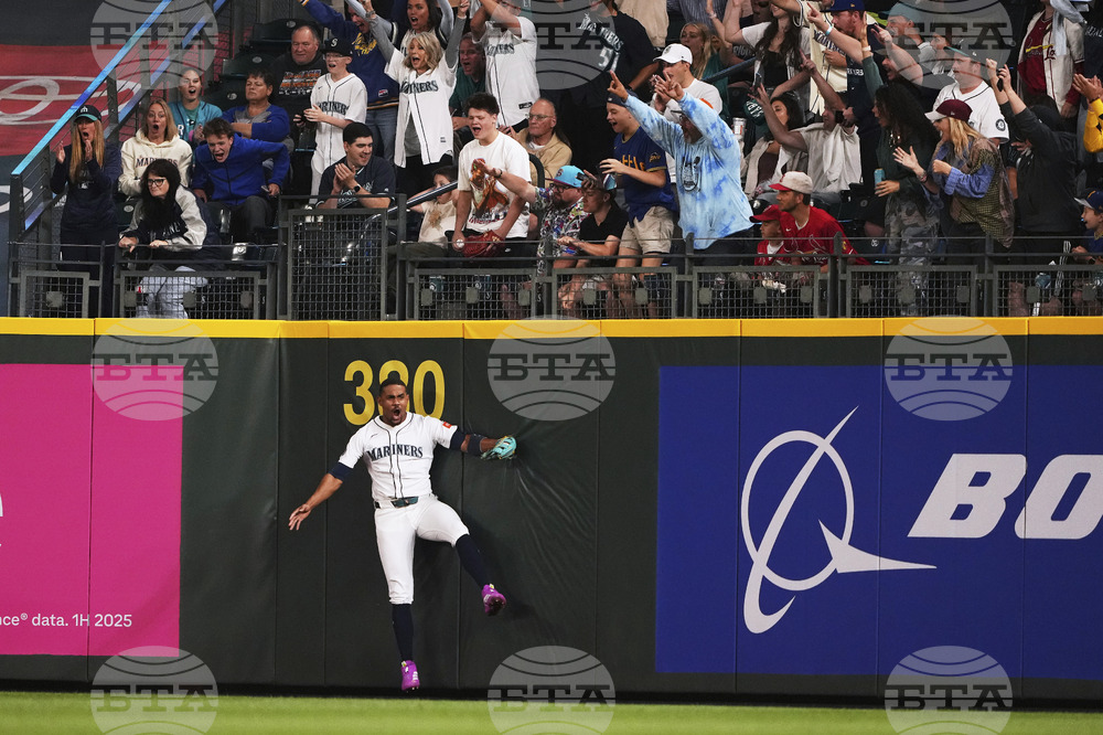Seattle Mariners center fielder Julio Rodriguez reacts after making a leaping catch of a long fly ball from St. Louis Cardinals' Ivan Herrera during the seventh inning of a baseball game Tuesday, Sept. 9, 2025, in Seattle. (AP Photo/Lindsey Wasson)