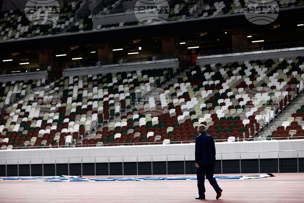 FILE - IOC President Thomas Bach looks at the empty stand during a visit to the National Stadium, the main venue for the Tokyo Olympic and Paralympic Games postponed until 2021 due to the coronavirus pandemic, in Tokyo, on Nov. 17, 2020. (Behrouz Mehri/Pool Photo via AP, File)