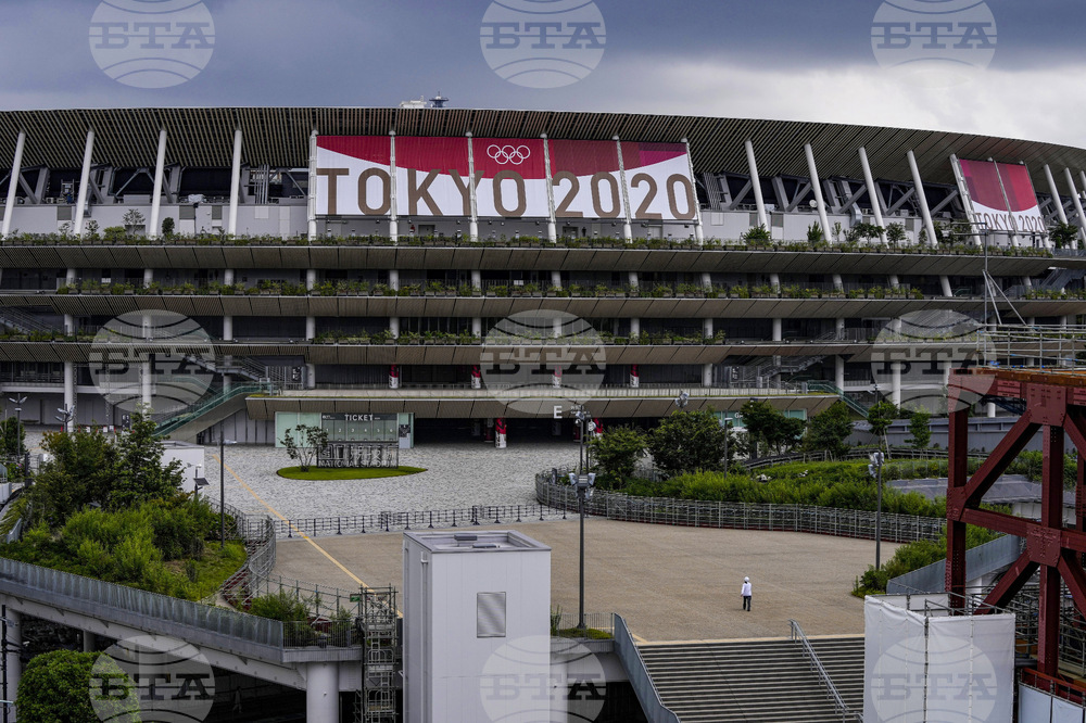 FILE - A worker walks through the front entrance of the National Stadium on June 23, 2021, in Tokyo, one month before the July 23 opening of Tokyo Olympics. (AP Photo/Kiichiro Sato, File)