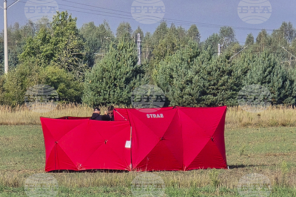 In this image made from video, Police and Military Police secure parts of a damaged object shot down by Polish authorities at a site in Wohyn, Poland, Wednesday, Sept. 10, 2025. (AP Photo/Rafal Niedzielski)
