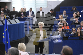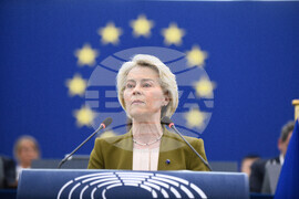 European Commission President Ursula von der Leyen gestures as she delivers a major state of the union speech at the European Parliament in Strasbourg, eastern France, Wednesday, Sept. 10, 2025. (AP Photo/Pascal Bastien)