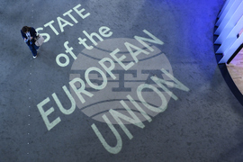 A member of the media walks over the logo of the state of the European Union at the European Parliament in Strasbourg, eastern France, Wednesday, Sept. 10, 2025. (AP Photo/Pascal Bastien)
