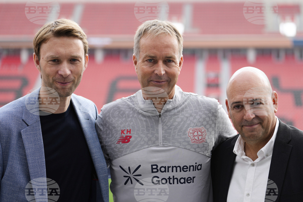 Sporting director Simon Rolfes, new head coach Kasper Hjulmand and CEO Fernando Carro, from left, pose for a photo after the presentation of the new head coach of Bundesliga soccer club Bayer Leverkusen, at a press conference at the BayArena in Leverkusen, Germany, Wednesday, Sept. 10, 2025. (AP Photo/Martin Meissner)