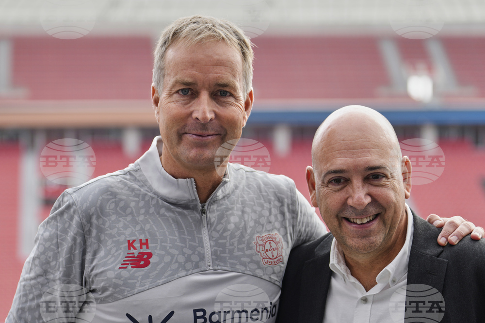 New head coach Kasper Hjulmand, left and Bayer Leverkusen CEO Fernando Carro, pose for a photo after the presentation of the new head coach of Bundesliga soccer club Bayer Leverkusen, after a press conference, at the BayArena in Leverkusen, Germany, Wednesday, Sept. 10, 2025. (AP Photo/Martin Meissner)