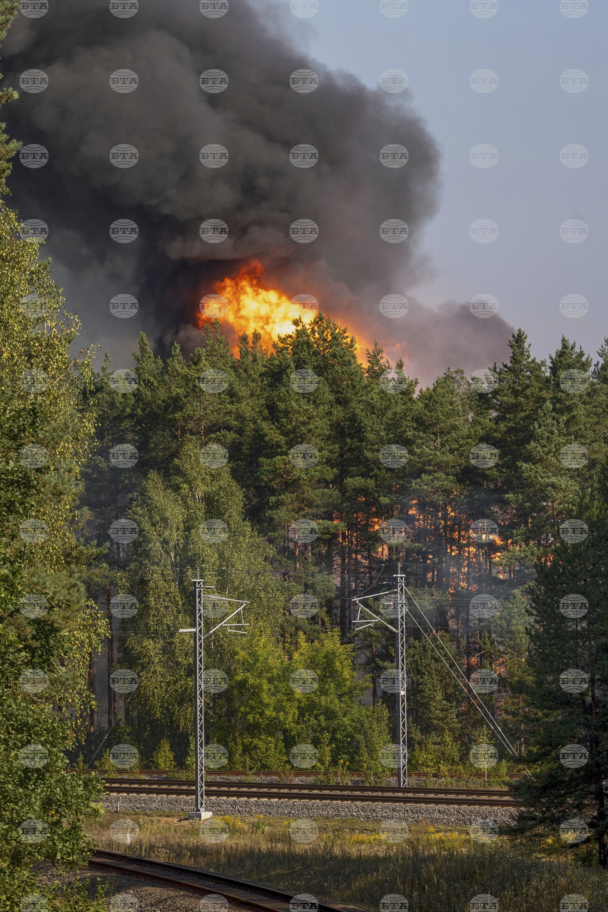 Smoke and flames rise following powerful explosions after several rail cars loaded with liquefied gas caught fire in the suburbs of Vilnius, Lithuania, Wednesday, Sept. 10, 2025. (AP Photo/Mindaugas Kulbis)